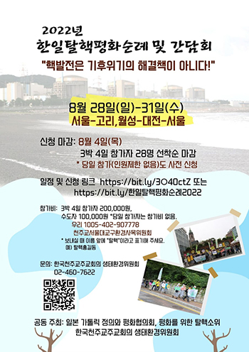 주교회의 생태환경위원회(위원장 박현동 아빠스)는 28~31일 ‘2022년 한일 탈핵 평화순례 및 간담회’를 연다. 코로나19 팬데믹으로 인해 3년 만에 대면으로 진행되는 이번 행사는 ‘기후위기의 해결책이 아닌 핵발전’을 주제로 삼았다.