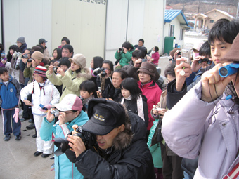숨을 죽인 채 가만히 탐조하던 아이들이 논으로 달려나가자 화들짝 놀란 쇠기러기들이 하늘로 날아오르는 모습이 장관이다. 짧은 비행이어서 정확히 브이(V)자 형태로 떼 지어 날지는 않았지만, 처음으로 보는 쇠기러기 행렬에서 눈을 떼지 못한다. 현지 농가에 따르면, 때로 논바닥이 보이지 않을 정도로 새카맣게 내려 앉아 먹이를 먹는다고 한다.