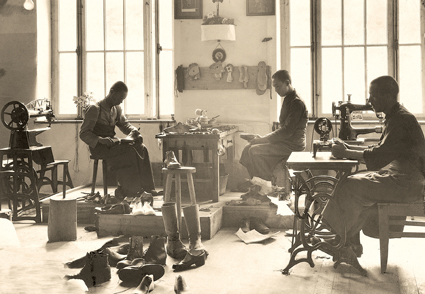 ▲ 덕원수도원 인쇄소에서 강 세바스티아노 수사와 루도비코 피셔 수사가 한국인 직원들과 함께 일하고 있다.
