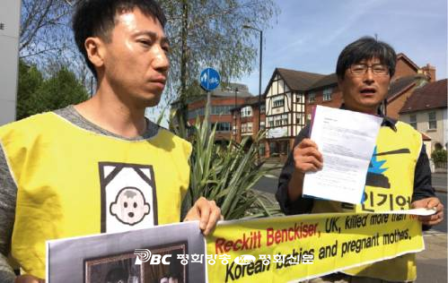 ▲ 최예용 환경보건시민센터 소장(오른쪽)이 지난 5월 영국 옥시레킷벤키저 본사 앞에서 가습기 살균제 피해를 알리고, 진상 규명을 촉구하는 항의 시위를 하고 있다. 환경보건시민센터 제공 |