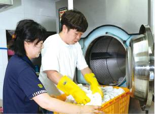 ▲ 서울대교구 대신학교 김보습 신학생이 봉사자의 도움을 받으며 삶은 빨래를 대형 세탁기에 넣고 있다. 오세택 기자 |