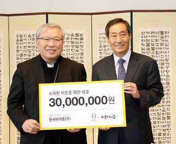 한국이지론 조용흥(요셉) 대표이사는 7일 서울대교구청 신관 9층 교구장 집무실에서 염수정 추기경을 예방, 소외된 이웃 돕기 성금 3000만 원을 (재)바보의나눔에 기부했다. 바보의나눔 재단은 염 추기경을 통해 기부 증서와 함께 기부 감사 선물을 전했다.