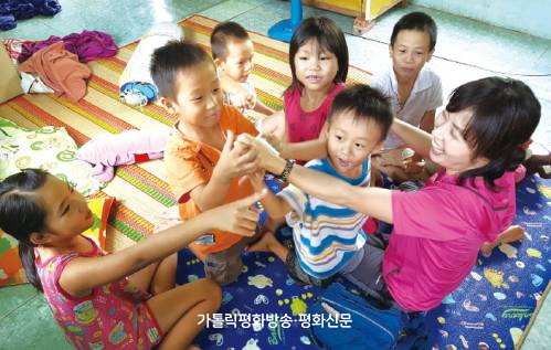 ▲ 본오동본당 빈첸시오회원(맨 오른쪽)이 베트남 고아들과 놀이를 하고 있다.