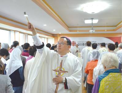 ▲ 인천 부평구 갈산종합사회복지관 축복식에서 교구장 정신철 주교가 성수를 뿌리며 축복하고 있다. 맹현균 기자 |