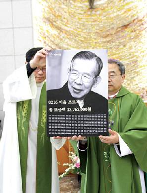 ▲ 지난 2월 용인천주교공원묘지 김수환 스테파노 추기경 기념 경당에서 봉헌된 김 추기경 선종 8주기 추모 미사 중에 바보의나눔 이사장 손희송(오른쪽) 주교와 상임이사 정영진 신부가 0216 이음 프로젝트를 통해 모은 특별 봉헌금 1376만여 원이 김 추기경의 얼굴로 형상화된 패널을 들어보이며 감사를 전하고 있다. |