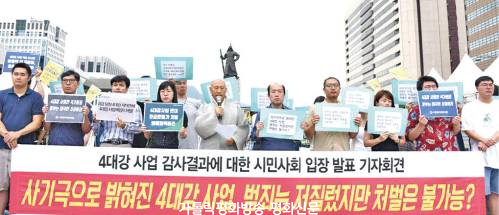 지난 5월 24일 한국환경회의가 청구한 ‘4대강 사업에 대한 공익 감사’ 결과가 5일 발표되자 4대강재자연화시민위원회와 한국환경회의는 곧바로 광화문에서 입장을 발표, 4대강 사업은 국기 문란 범죄라며 재발 방지를 위한 책임 규명이 절실하다고 촉구했다.