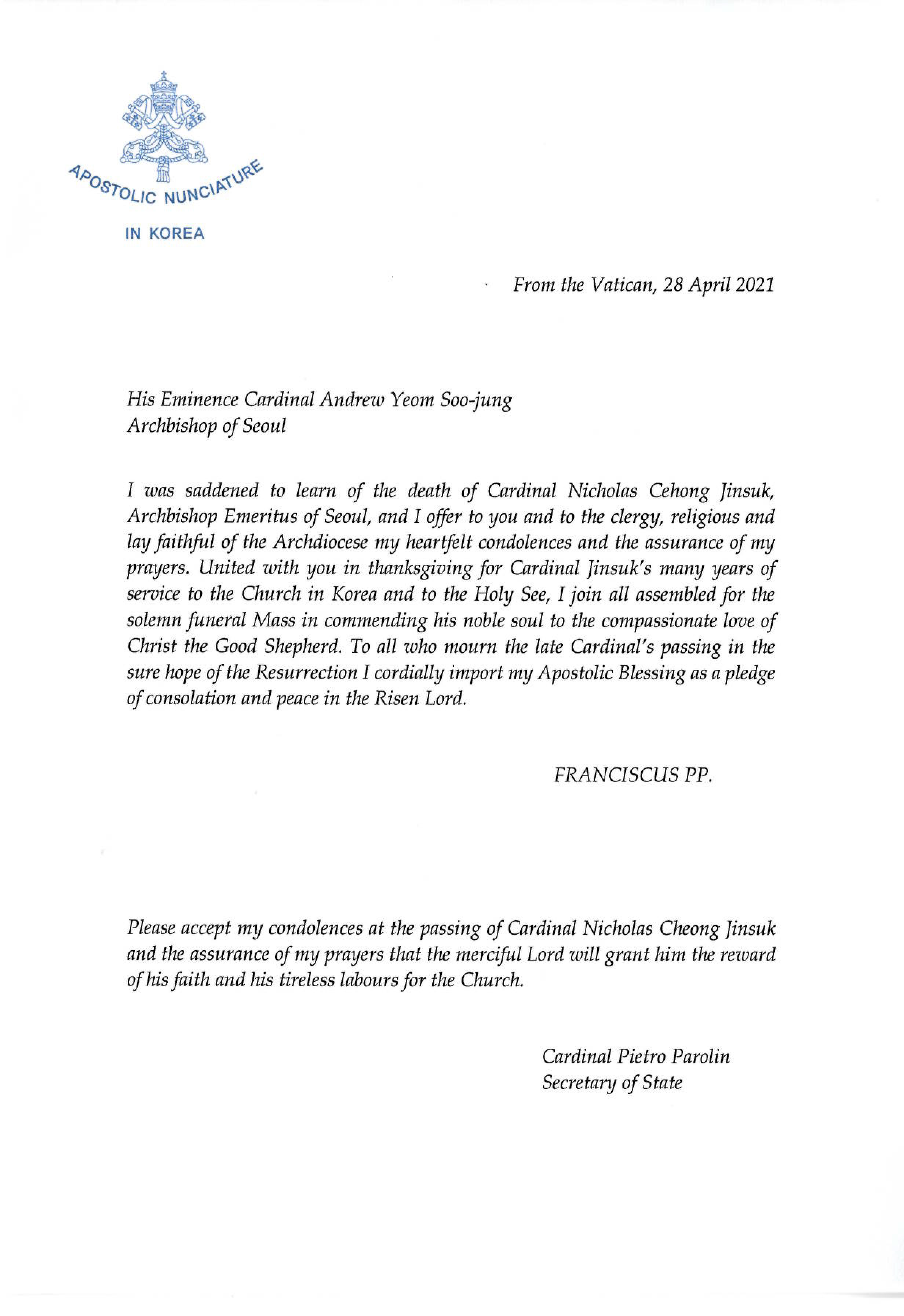 교황청 국무원 총리 피에트로 파롤린 추기경도 교황의 서한과 함께 정 추기경의 선종에 애도 서한을 보냈다. 다음은 서한 전문.