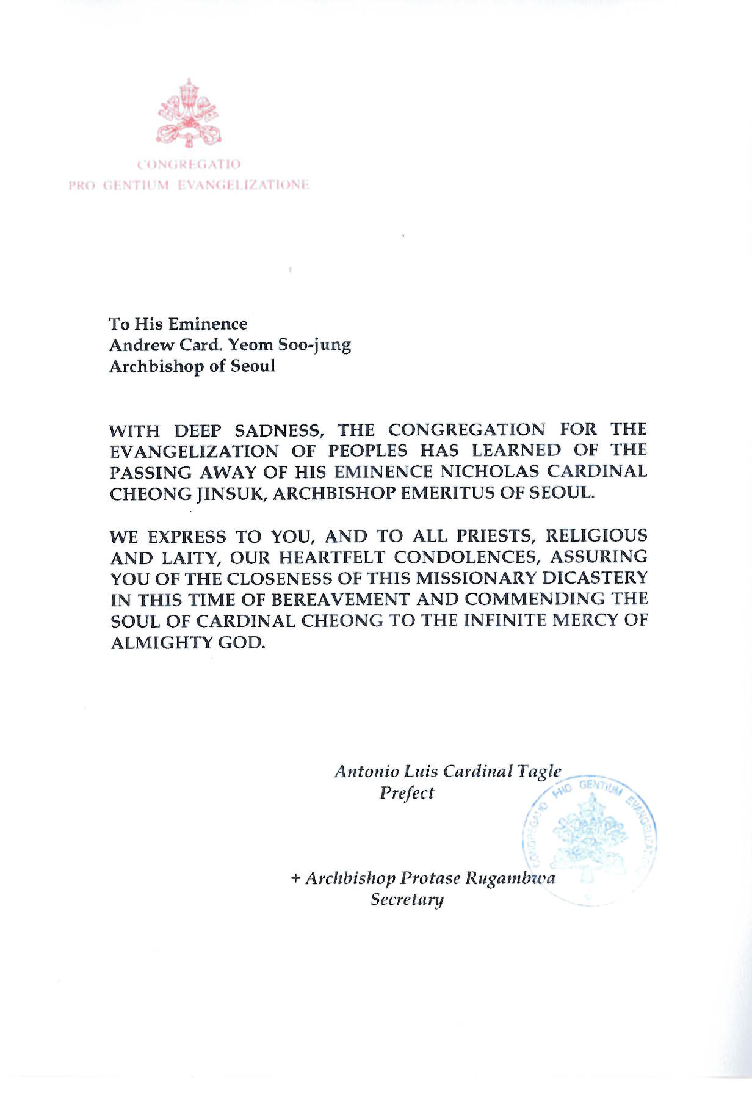 한편, 교황청 인류복음화성 장관 루이스 안토니오 타글레 추기경도 애도 서한을 보냈다. 다음은 서한 전문.