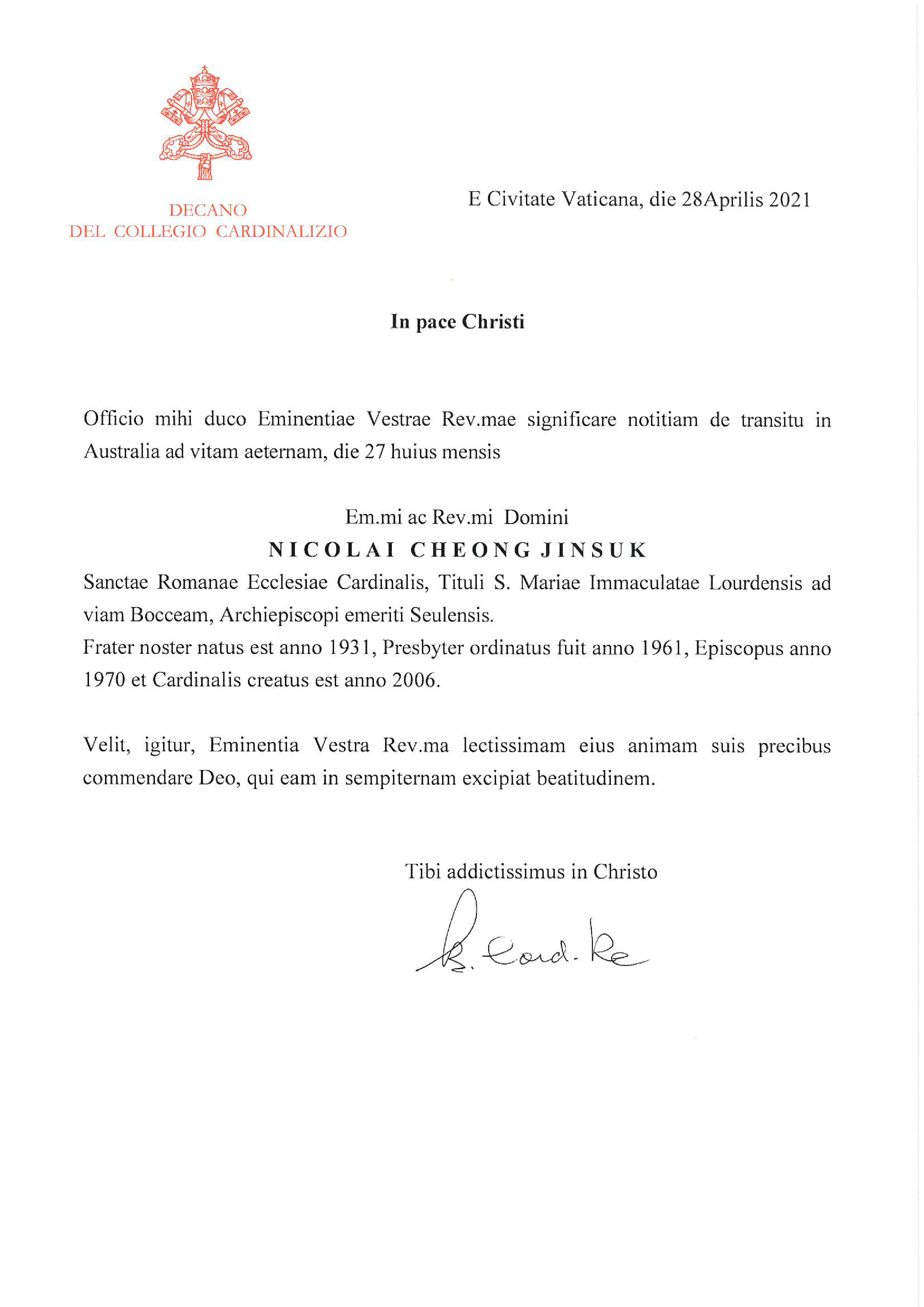 이어 교황청 추기경단 수석 추기경 조반니 바티스타 레 추기경도 애도 서한을 28일(현지시각) 염수정 추기경에게 보냈다. 다음은 서한 전문.