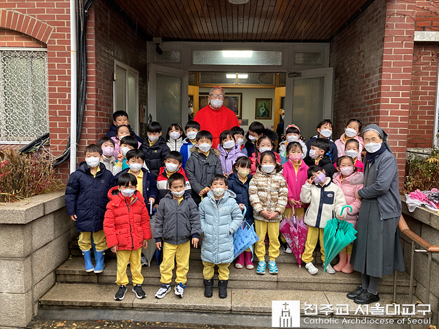 △ 염수정 추기경이 30일 이임미사 후, 혜화동 주교관에서 혜화유치원생들과 기념 촬영을 하고 있다.