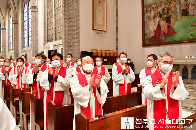 △ 염수정 추기경 이임 감사미사에서 교구 사제단이 박수로 염 추기경에게 화답하고 있다.
