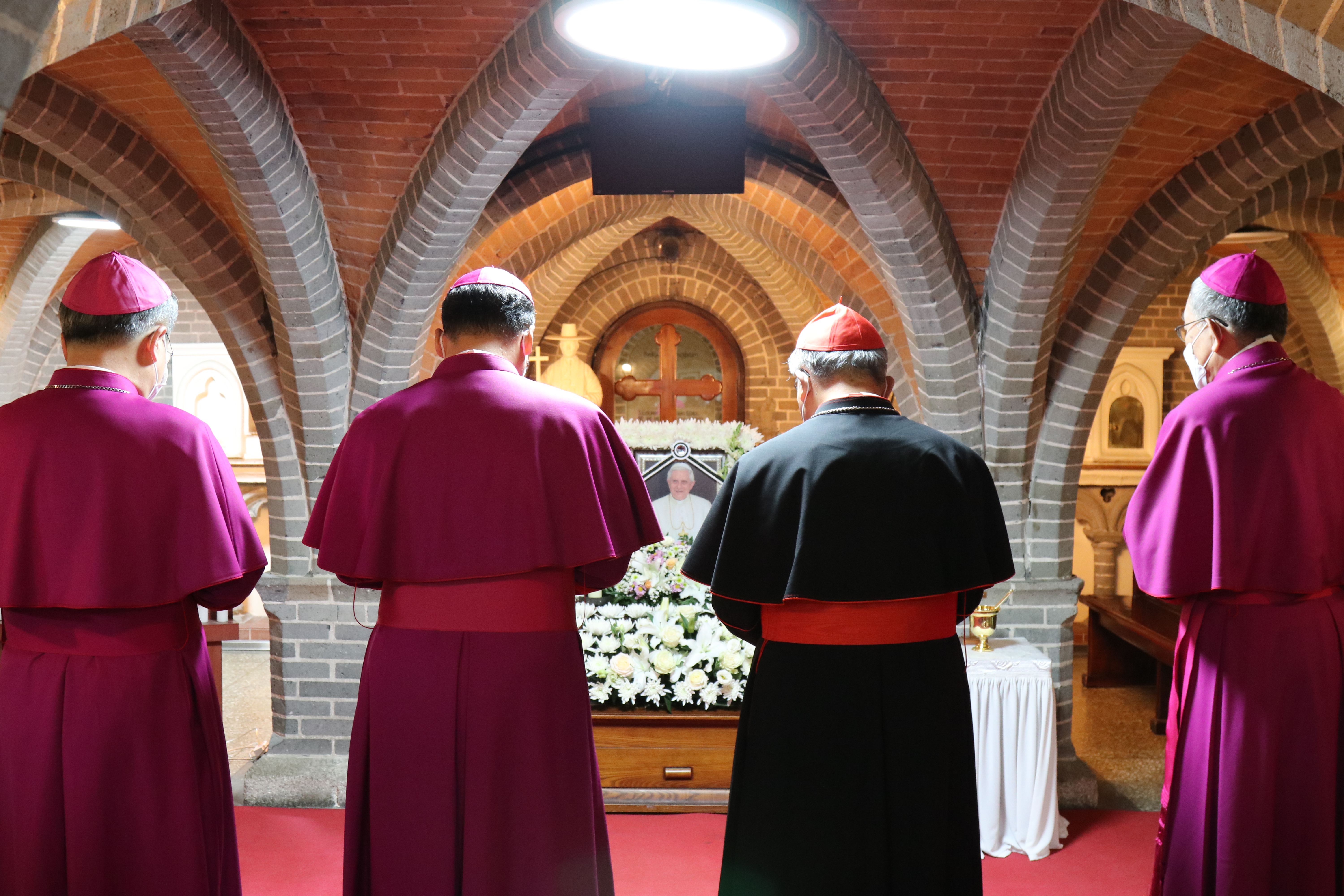 △ 정순택 대주교(가운데 왼쪽), 염수정 추기경(가운데 오른쪽), 손희송 주교(맨 왼쪽), 구요비 주교(맨 오른쪽)가 베네딕토 16세 전임 교황의 빈소에서 조문하고 있다.
