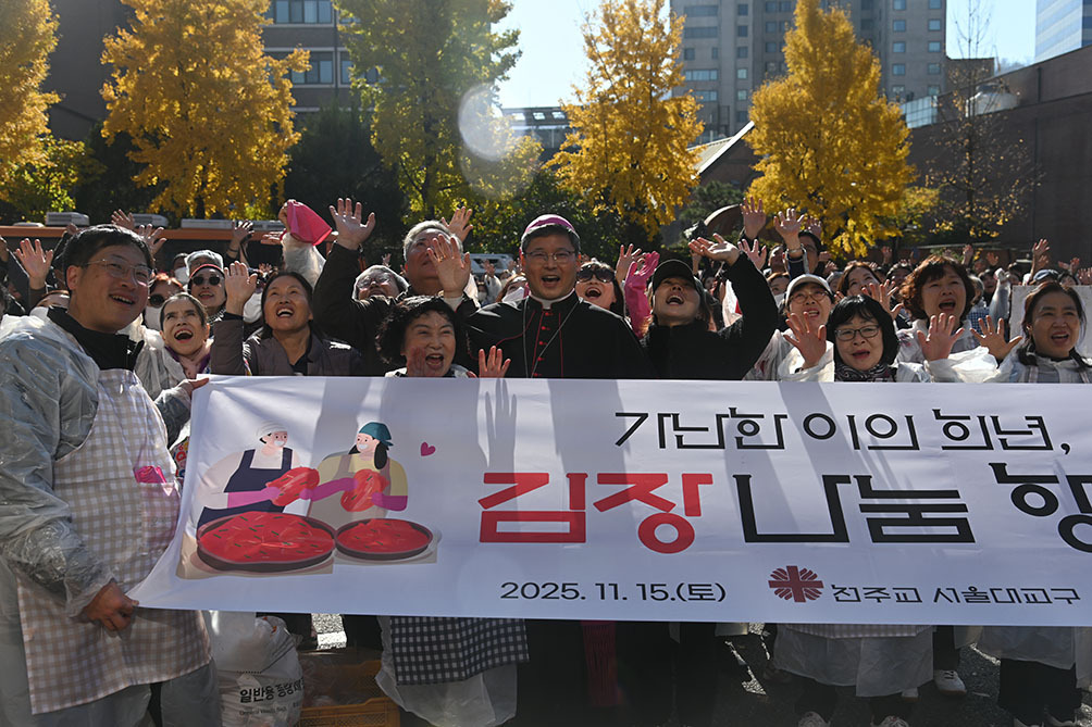 제9차 세계 가난한 이의 날을 하루 앞둔 15일 오전, 맑은 가을 하늘 아래 서울대교구청 별관 주차장에서 교구 사회사목국장 윤병길 신부의 시작 기도가 끝나자마자 위생복·고무장갑 등으로 완전무장한 봉사자 400여 명이 일사불란하게 움직였다. 특히 절임배추에 꼼꼼히 김칫소를 버무리는 주부 9단들의 손놀림이 예사롭지 않다. 가난으로 고통받는 이웃에게 희년과 복음의 기쁨을 전하고자 교구 사회사목국이 마련한 ‘가난한 이의 희년, 김장 나눔 행사’ 풍경이다.