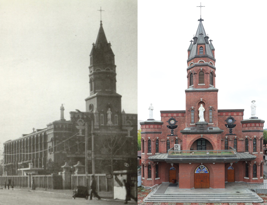 1960년대 주교좌 중앙성당과 현재의 중앙성당 모습. 전주시 제공