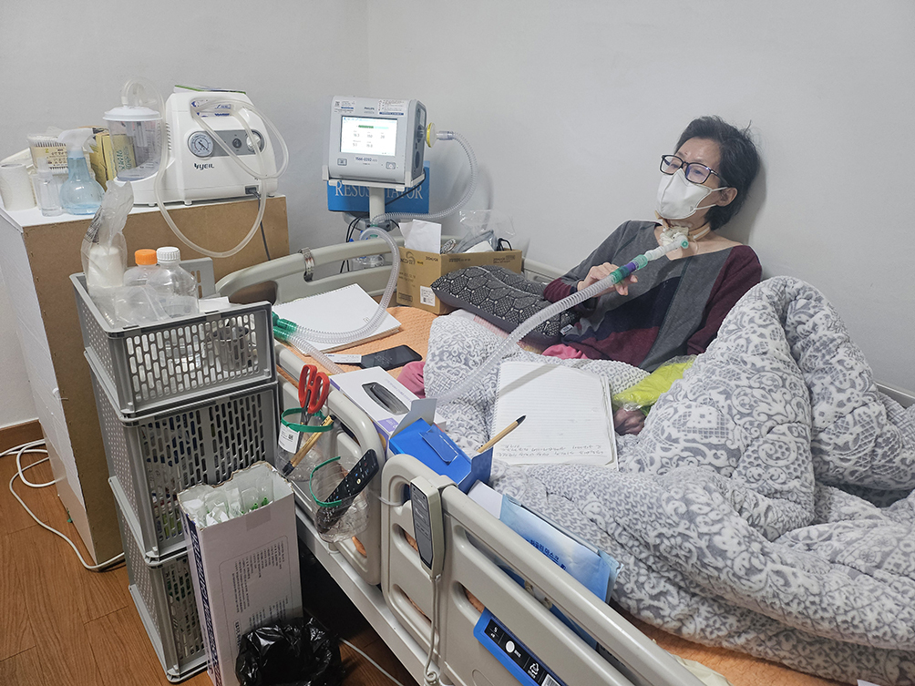 박씨는 언제 어떻게 돌발상황이 생길지 몰라 24시간 간병이 필요한 상태다. 요양병원에 입원해야 하지만, 병원비가 부담인 데다 병원에서 지내는 것이 더 고통스러워 집에서 지내고 있다. 지난달엔 자다가 호흡기가 빠졌는데, 제대로 처치하지 못해 큰일이 날 뻔했다. 아침 일찍 방문한 요양보호사가 그를 발견하고 119에 신고해 겨우 목숨을 건졌다. 하지만 응급실에서 받은 심폐소생술로 갈비뼈가 부러져 고통이 이만저만이 아니다. ‘그날 이후로 숨 쉬기가 너무 괴로워졌습니다. 전에는 이 정도까지는 아니었어요.’ 그는 짧게 답을 써내려간 뒤 펜을 내려놓고 재빨리 관을 들어 올려 크게 숨을 내쉬었다.