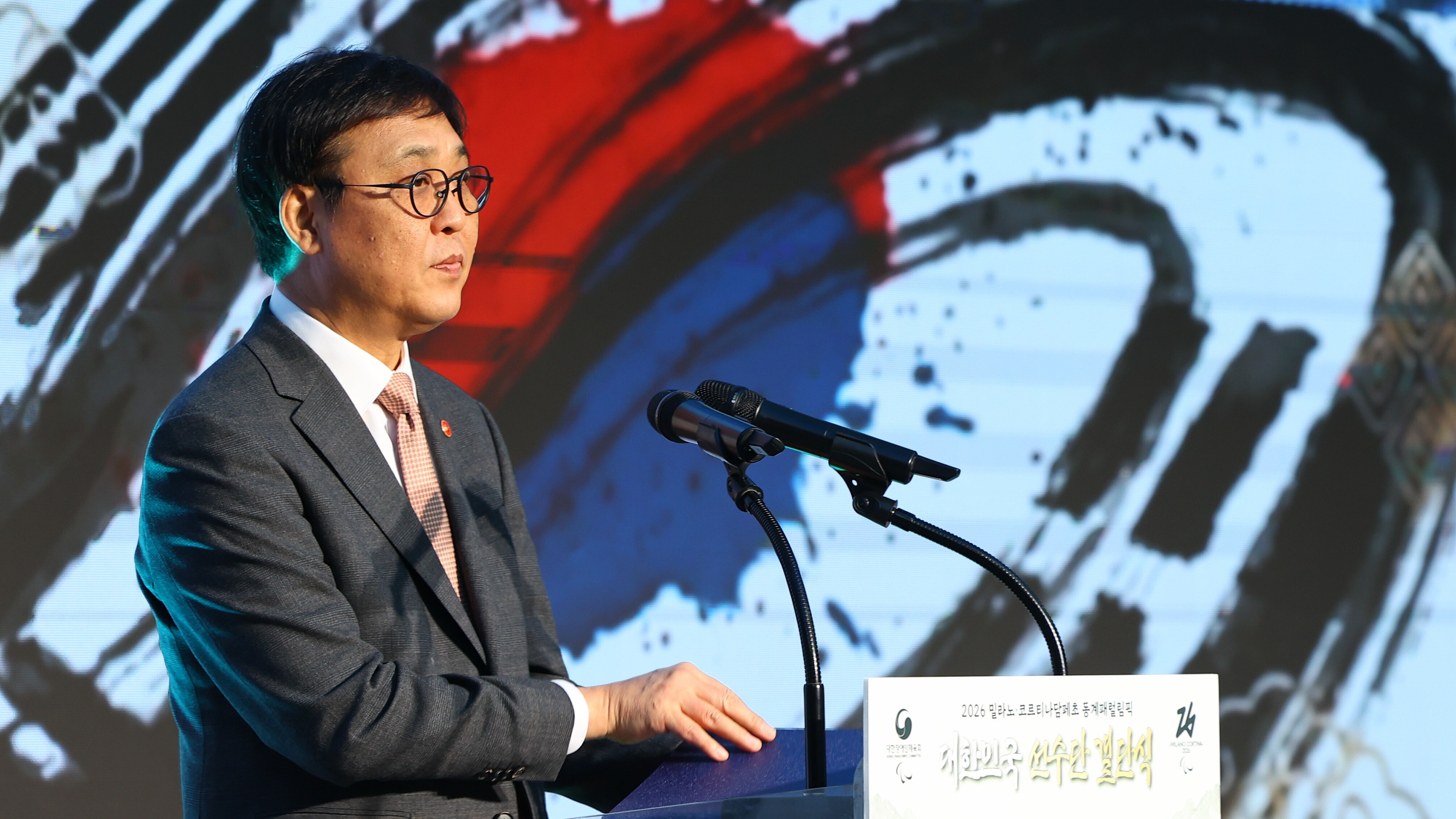 최휘영 문화체육관광부 장관이 2일 오후 서울 송파구 서울 올림픽 파크텔에서 열린 2026 밀라노·코르티나담페초 동계 패럴림픽 대한민국 선수단 결단식에서 격려사를 하고 있다. 뉴시스