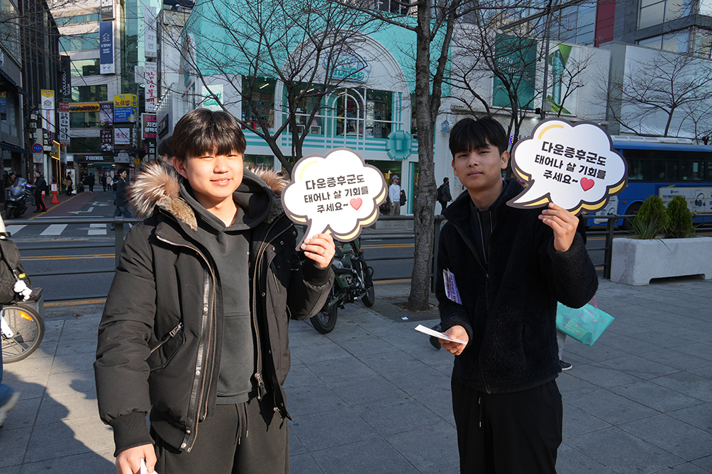 시민들은 “다운증후군도 태어나 살 권리를 주세요”란 문구가 적힌 패널을 함께 들어 보이며 호응했다. 캠페인에 봉사자로 참여한 대학 간호학과 학생들은 “장애를 지녔다고 낙태되는 현실이 매우 심각한 문제임을 잘 알고 있다”며 “계속 참여하겠다”고 했다.