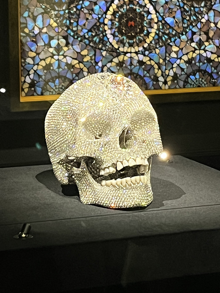 데이미언 허스트 작 삼면화 ‘신의 무한한 권능과 영광을 묵상하며’(2008년)와 앞쪽 두개골 ‘신의 사랑을 위하여’(2007년).