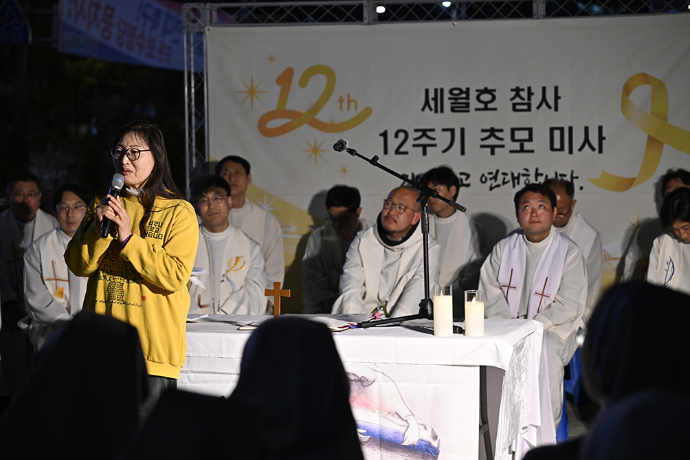 남자장상협 정평위원장 양두승(작은형제회) 신부는 강론에서 “시간이 많이 지났어도 참사 당시 그날의 기억을 또렷하게 기억하고 있는 것은 그만큼 우리 모두에게 쓰리고 아픈 상처로 깊게 남아 지워지지 않는 흉터처럼 되어버렸기 때문”이라며 “남겨진 가족들에게는 아직도 2014년 4월 16일에 멈춰 있을 것”이라고 말했다. 아울러 “12년 만에 세월호 참사 당일 청와대가 만들거나 보고받은 문서 목록 등을 공개하라는 법원 판단이 있었다”면서도 “결과적으로 책임지는 사람이 없었다는 점은 우리를 더 허탈하게 만들고 분노를 자아낸다”고 말했다. 그러면서 “희생되신 분들을 당연히 기억함과 동시에 사고의 책임을 묻고 처벌하는 것, 더 나아가 같은 참사가 발생하지 않도록 시스템과 환경을 개선하는 데 적극 함께할 수 있어야 하겠다”고 당부했다. 여자수도회장상연합회 수녀들은 성가 ‘꽃’을 부르며 추모했다.