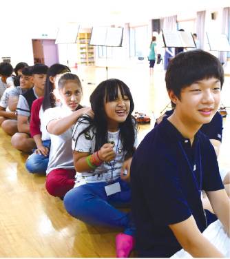 | ▲ 대만 알투스바이올린연주단원들과 PBC소년소녀합창단원들이 12일 합동 연주회 연습 쉬는 시간에 서로의 어깨를 안마해 주며 화기애애한 분위기를 자아내고 있다. 이힘 기자 |
