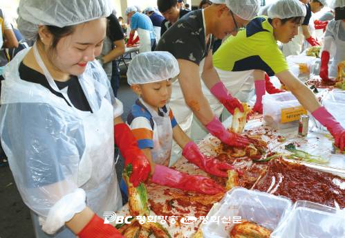 서울가톨릭사회복지회가 위탁 운영하는 신당ㆍ유락종합사회복지관과 대한불교조계종이 위탁 운영 중인 중림종합사회복지관, 중구, KB국민은행은 8월 27일 오전 서울 중구 서소문로6길 중림 지상 주차장에서 지역 내 소외계층을 위한 여름 김장 행사를 벌였다.