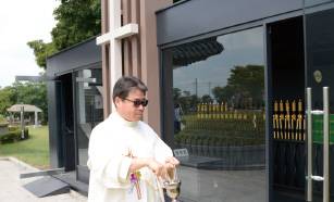 | ▲ 김경식 신부가 성지 내 무명 생매장 순교자의 묘 옆에 새로 마련한 초 봉헌실을 축복하고 있다. |