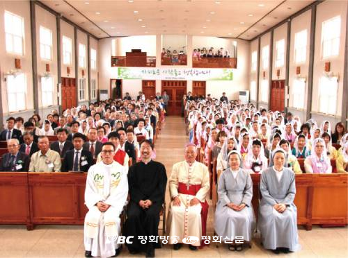 | ▲ 김운회 주교와 오세호 신부(김 주교 왼쪽), 박명수 보좌 신부와 수도자, 신자들이 함께하고 있다.  춘천교구 문화홍보국 제공 |