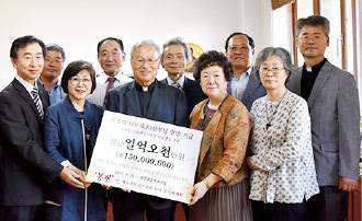 | ▲ 이현주(왼쪽 두 번째) 회장이 김운회 주교(가운데)에게 기금을 전달하고 있다.