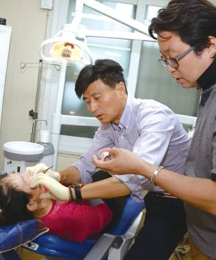 ▲ 주동현 원장(가운데)이 노숙인 출신 여성을 치료하며 김태준 프로텍치과기공소장과 함께 틀니를 어떻게 제작해야 할지 논의하고 있다.