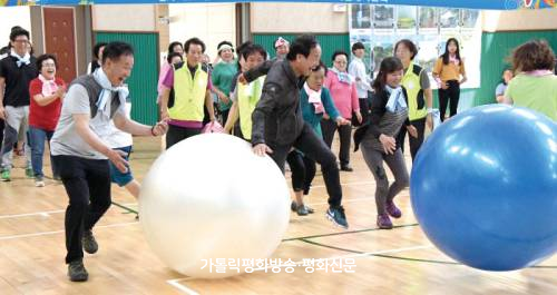 4일 괴산국체육센터에서 열린 청주교구 괴산본당(주임 김용일 신부) 설립 60주년 기념 가족운동회에서 신자들이 ‘공굴리며 달리기’를 하며 즐거워하고 있다. 가족운동회는 본당과 공소 신자 800여 명이 함께한 가운데 본당 공동체의 단합과 일치를 지향하며 단체 줄넘기와 과자 찾아 먹고 달리기, 손님 찾아 달리기 등 4개 종목별로 열렸고, 경기 직후엔 김치냉장고와 TV, 생활필수품 등 기념품 추첨이 진행됐다. 장광동 명예기자 jang@cpbc.co.kr