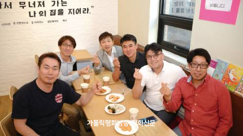 ▲ 16일 서울 염리동성당 휴게실에서 서울가톨릭사회복지회 담당관을 만나 만나 2017 서울대교구 본당 사회복지 공모지원사업 중간 평가를 한 뒤 기념 촬영을 하는 조아모 회원들. 오세택 기자 |