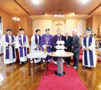 ▲ 인천교구장 정신철 주교 등 사제단과 신자 대표들이 덕적도준본당 설정 50주년 축하식을 하고 있다. |