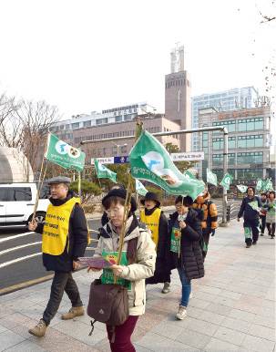 | ▲ 탈핵 희망 국토 도보순례단이 10일 서울 종로성당을 출발해 광화문을 향해 걷고 있다. |
