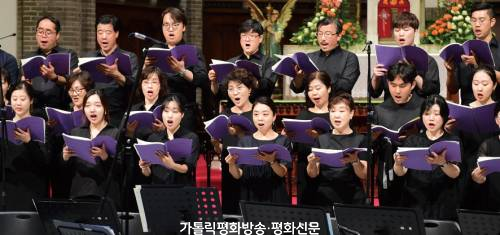 한국 천주교 평신도사도직단체협의회(회장 손병선)가 5월 28일 서울대교구 주교좌 명동대성당에서 개최한 ‘한국 평신도 희년 기념 음악회’에서 트리니타스 합창단이 제1회 우리성가 작곡공모 최우수상 곡인 ‘성가정’을 노래하고 있다. 이날 음악회에는 서울대교구장 염수정 추기경, 총대리 겸 주교회의 평신도사도직위원회 위원장 손희송 주교, 손병선(아우구스티노) 한국평협 회장을 비롯해 신자 800여 명이 객석을 메우고, 노래가 있는 희년의 밤을 감상했다. 이정훈 기자 sjunder@cpbc.co.kr