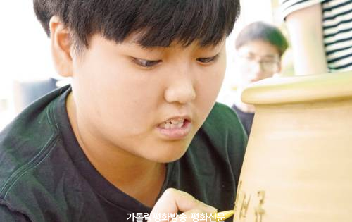▲ 다산하늘센터가 10일 진행한 전통 옹기 제작 체험 행사에서 한 장애인이 옹기에 그림을 그리고 있다. 다산하늘센터 제공 |