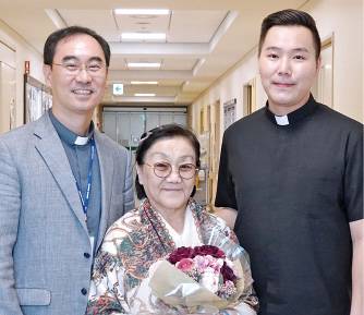 ▲ 서울성모병원 영성부장 천만성(왼쪽) 신부가 퇴원을 앞둔 어머니 투멘치메크씨와 아들 엥흐 신부를 축하하고 있다. 서울성모병원 제공 |