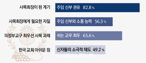 한편, 박문수 박사는 4~5월 심포지엄 준비를 위해 본당 사목회장ㆍ평단협 소속 단체회원 1300여 명을 대상으로 한 의식조사 결과를 발표했다.<표 참조> 조사 결과에 따르면, 본당 사목회장 교회활동 및 직무인식 조사에서 사목회장이 된 계기를 묻는 말에 ‘주임 신부의 권유’가 82.8로 가장 많았고, 사목회장에게 필요한 자질을 묻는 항목에서는 ‘주임 신부와의 소통 능력’이 56.3로 가장 많았다. 또 의정부교구의 최우선 사목 과제를 묻는 항목에서는 ‘쉬는 교우 회두’(65.6), ‘신자 재교육’(51.7) ‘청소년ㆍ청년사목’(47.5) ‘사제 쇄신’(31.8) 순으로 응답자가 많았다. 한국 교회의 아쉬운 점으로는 ‘신자들의 소극적 태도’(49.2), ‘크게 늘어난 쉬는 교우’(31.5)가 응답률이 높았다.