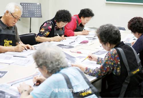 ▲ 행복전시회에 작품을 출품하기 위해 할머니 할아버지들이 그림을 그리고 있는 모습. |