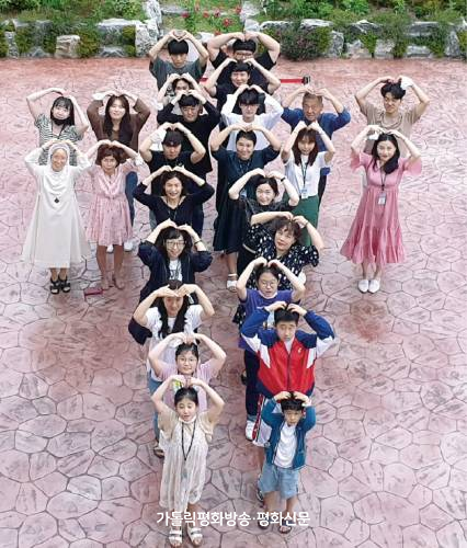 ▲ 부산 이기대본당 청소년분과를 맡고 있는 구성원들이 성당 마당에서 십자가 모양을 만들어 기념 촬영을 하고 있다. 신세경 홍보팀장은 온라인 주일학교 운영 비결에 대해 “청소년분과원 모두가 영상 제작에 내 일처럼 참여하고 있어서”라고 말했다. 이기대본당 청소년분과 제공 |