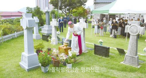 | ▲ 김주영 주교와 사제, 신자들이 5일 고 장익 주교 선종 1주기 추모 미사를 봉헌한 뒤 성직자 묘역에서 분향과 기도를 하고 있다.  춘천교구 문화홍보국 제공 |