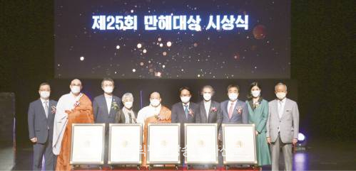 | ▲ 강원도 인제 하늘내린센터에서 12일 열린 제25회 만해대상 시상식에서 수상자들과 관계자들이 기념촬영을 하고 있다. 동국대학교 제공 |