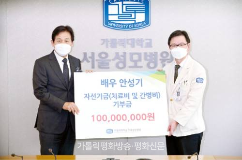 영화배우 안성기(요한 사도)씨가 가톨릭대학교 서울성모병원에 경제적으로 어려운 환자를 돕는 데 사용해 달라며 1억 원을 기부했다. 전달된 기부금은 서울성모병원 사회사업팀 기금으로 도움이 필요한 취약계층의 진료비 및 간병비로 쓰일 예정이다.