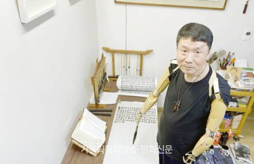 의수(義手) 로 그림 그리는 석창우(베드로, 65) 화백. 그의 본업은 그림이지만, 요즘은 성경에도 푹 빠져 있다. 2015년 1월부터 3년 6개월에 걸쳐 개신교 성경을, 2018년 7월부터 3년 1개월간 가톨릭 성경 필사를 끝냈지만, 요즘도 그는 날마다 3시간씩 성경 필사에 매달린다. 최근에도 39일에 걸쳐 요한복음을 필사했고, 이에 앞서 마르코복음과 로마 신자들에게 보낸 서간도 붓으로 옮겨 썼다. 제37회 성서 주간(21∼27일)을 앞두고 그에게 성경 말씀에 맛 들이며 살아가는 얘기를 들었다.