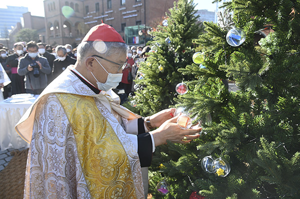▲ 염수정 추기경이 서울대교구 주교좌 명동대성당 앞에 설치된 ‘희망 트리’를 축복한 뒤 2022년 교구 사목교서를 담은 ‘희망꽃’을 걸며 교구 발전을 기원하고 있다. |