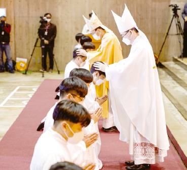 대전교구는 8일 충남 당진시 솔뫼성지 천주교복합예술공간 기억과 희망 성당에서 교구장 서리 김종수 주교 주례와 한정현 보좌주교, 교구 사제단 공동집전으로 교구 사제 서품식을 거행하고, 새 사제 9명을 배출했다. 이로써 교구 사제는 주교 2명을 포함해 모두 402명이 됐다. 프란치스코 전교봉사 수도회도 이날 인도 출신 쌍둥이 새 사제 2명을 배출하는 기쁨을 안았다. 다만 이날 사제 서품식은 코로나19 방역지침을 준수하기 위해 많은 이가 참석하지 못해 유튜브와 교구 누리집(www.djcatholic.or.kr)을 통해서도 생중계했다.