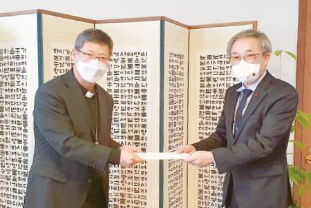 | ▲ 서울대교구장 정순택 대주교가 서울 명동 교구청 교구장 접견실에서 방정균 시민사회수석에게 문재인 대통령의 축전을 받고 있다. 교구 홍보위원회 제공 |