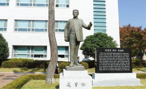 ▲ 대구가톨릭대 중앙도서관 앞에 설치된 안중근 의사 동상과 추모비. 대구가톨릭대 제공 |