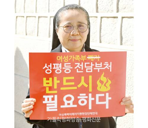 여성폭력피해자지원현장단체가 7일 서울 종로구 경복궁역 앞에서 마련한 여성가족부 폐지 반대 집회에 참석한 여성긴급전화 1366 전국협의회 회장 김성숙(드로스트, 착한목자수녀회) 수녀는 “여성폭력 피해자를 지원해왔던 현장 단체들은 성평등 관점 없는 여성가족부 폐지 논의를 심각하게 받아들일 수밖에 없다”며 이같이 말했다.