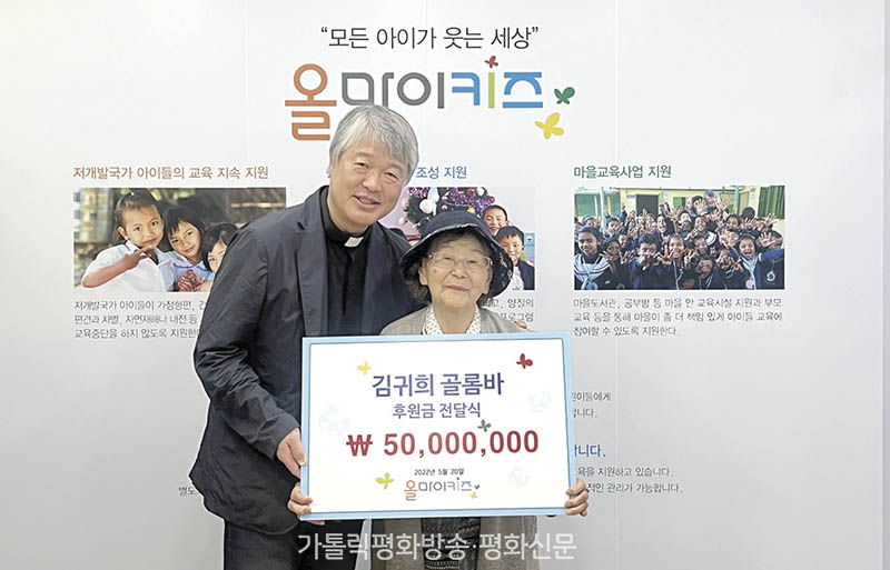 90세 할머니가 자녀에게 나눠줄 재산 일부인 5000만 원을 가난으로 교육을 받지 못하는 해외 어린이들을 돕는 데 쾌척했다. 김귀희(골룸바, 91, 춘천교구 임당동본당)씨는 20일 해외 어린이 교육 후원단체 ㈔올마이키즈를 방문해 이사장 김영욱 신부에게 기금을 전달했다.<사진>