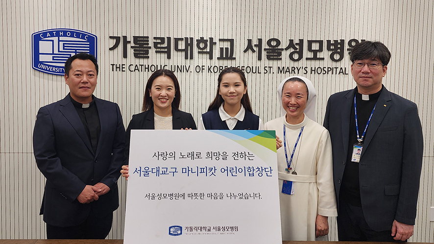 서울대교구 청소년국 소속 ‘마니피캇’ 어린이 합창단이 14일 가톨릭대학교 가톨릭성모병원에 자선 기금 200만 원을 전달했다. 해마다 환우들을 위한 노래해 온 어린이 합창단원들이 성금으로 마음을 더욱 모아 전한 것이다. 기금은 경제적으로 어려운 환자들의 치료비로 쓰일 예정이다.